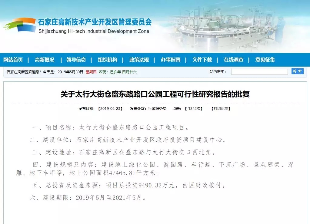 近日,小编从高新区政府网站发布的《关于太行大街仓盛东路路口公园工程可行性研究报告的批复》中获悉:石家庄高新区将投资亿元建设公园,地址在石家庄高新区仓盛东路与太行大街交口西北角,也就是国械堂产业园对面。