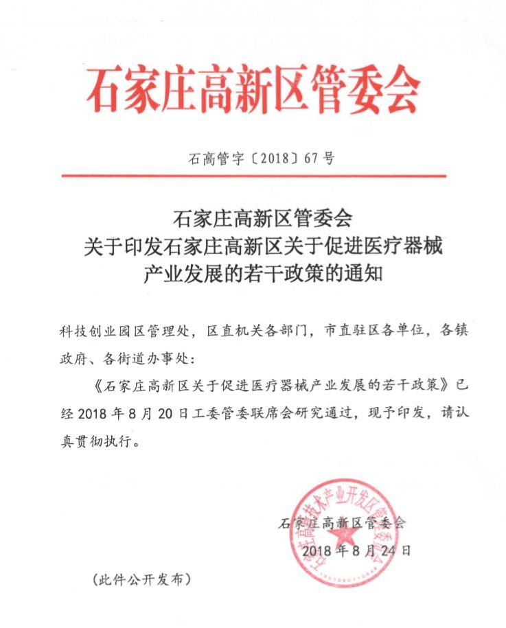 为此,石家庄高新区管委会还专门印发了《石家庄高新区关于促进医疗器械产业发展的若干政策》的通知,出台过一系列支持企业发展的政策。